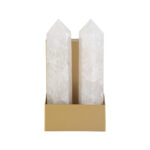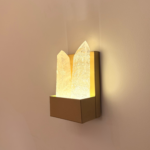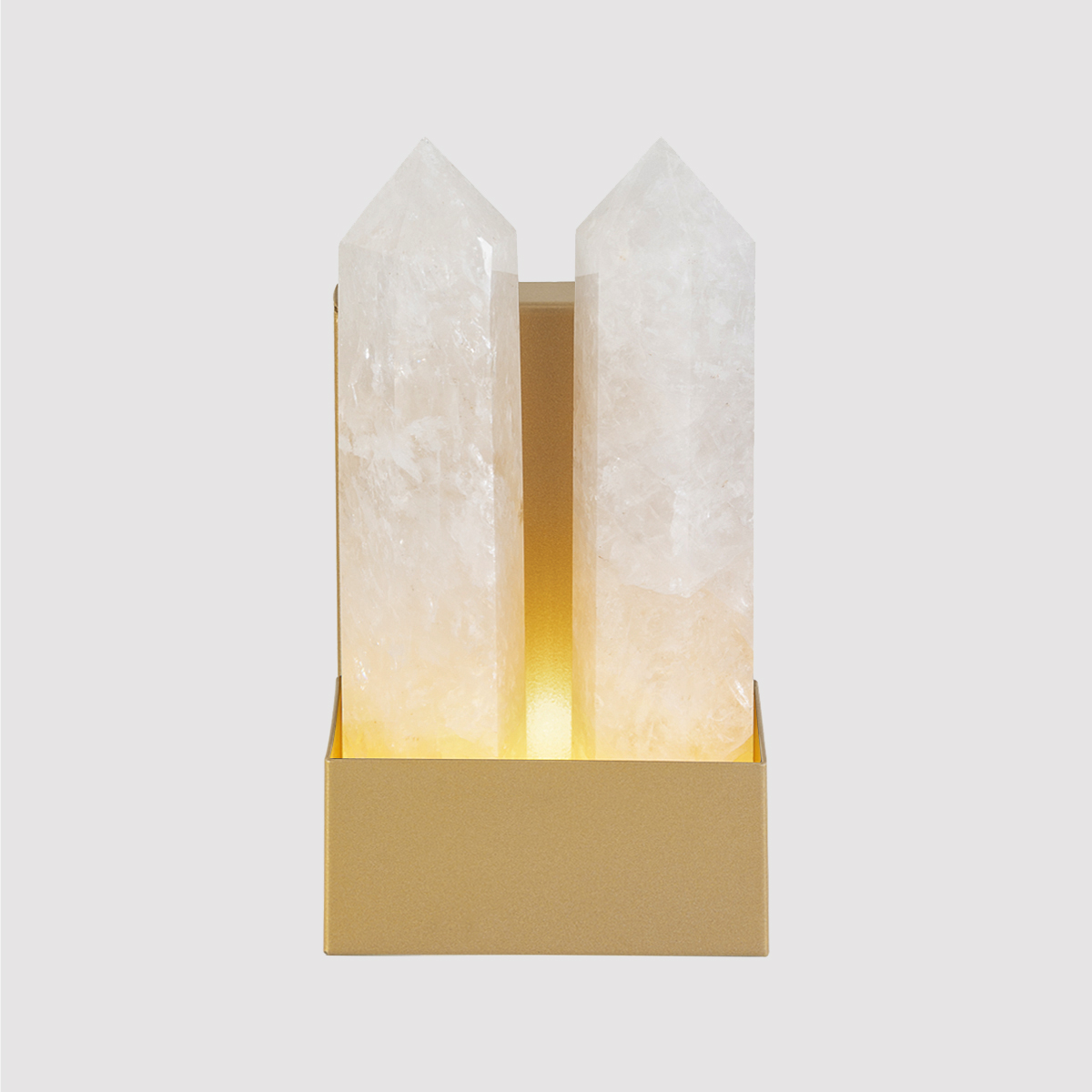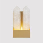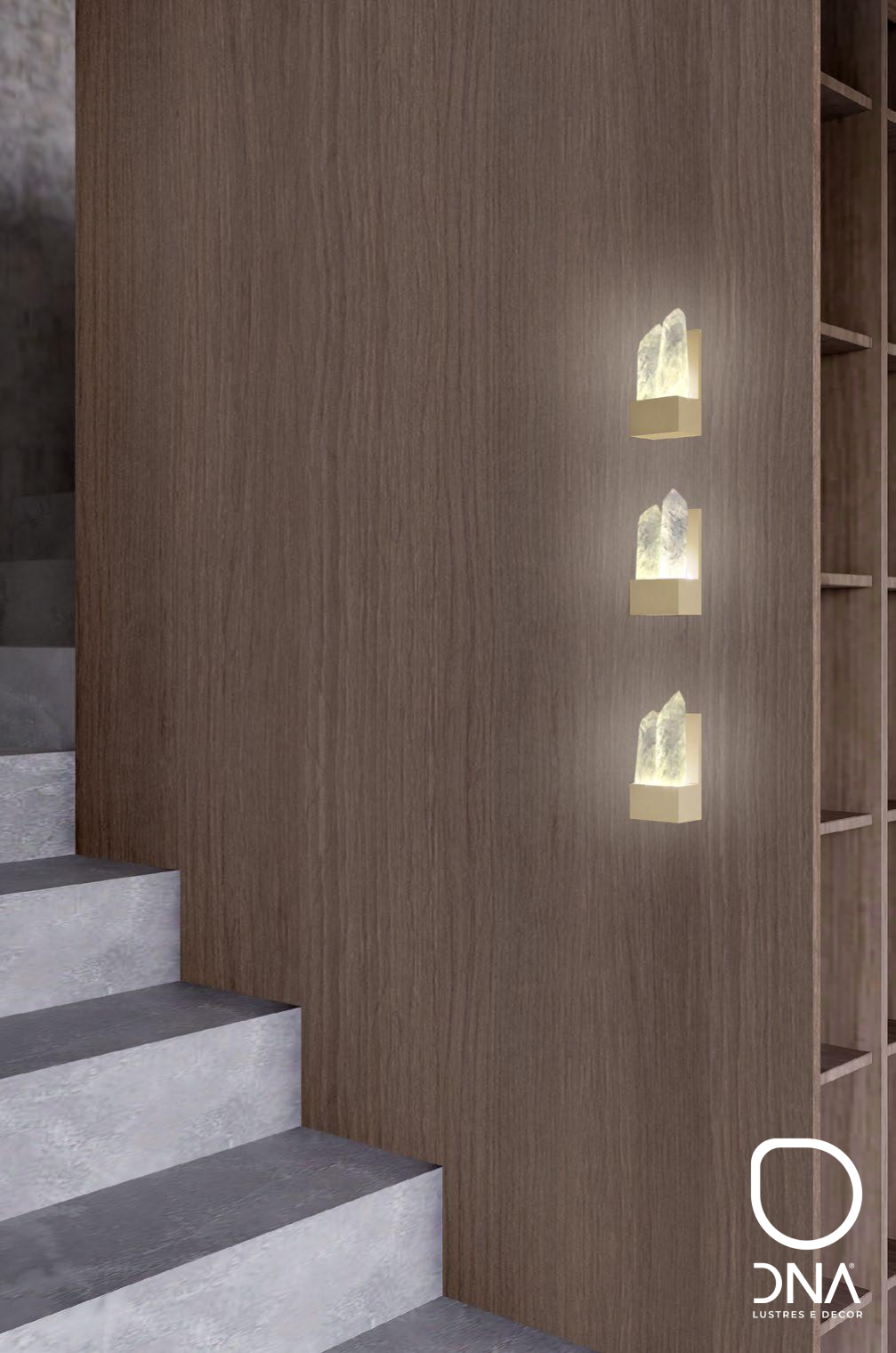 Arandela que usa quartzo natural como difusor de luz – cada peça é única devido às características da pedra. Combina materiais nobres (pedra natural + acabamentos metálicos premium) em formato escultural compacto. A luz através do quartzo cria efeito orgânico e aconchegante impossível de replicar com materiais sintéticos.