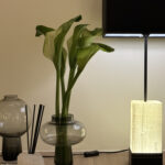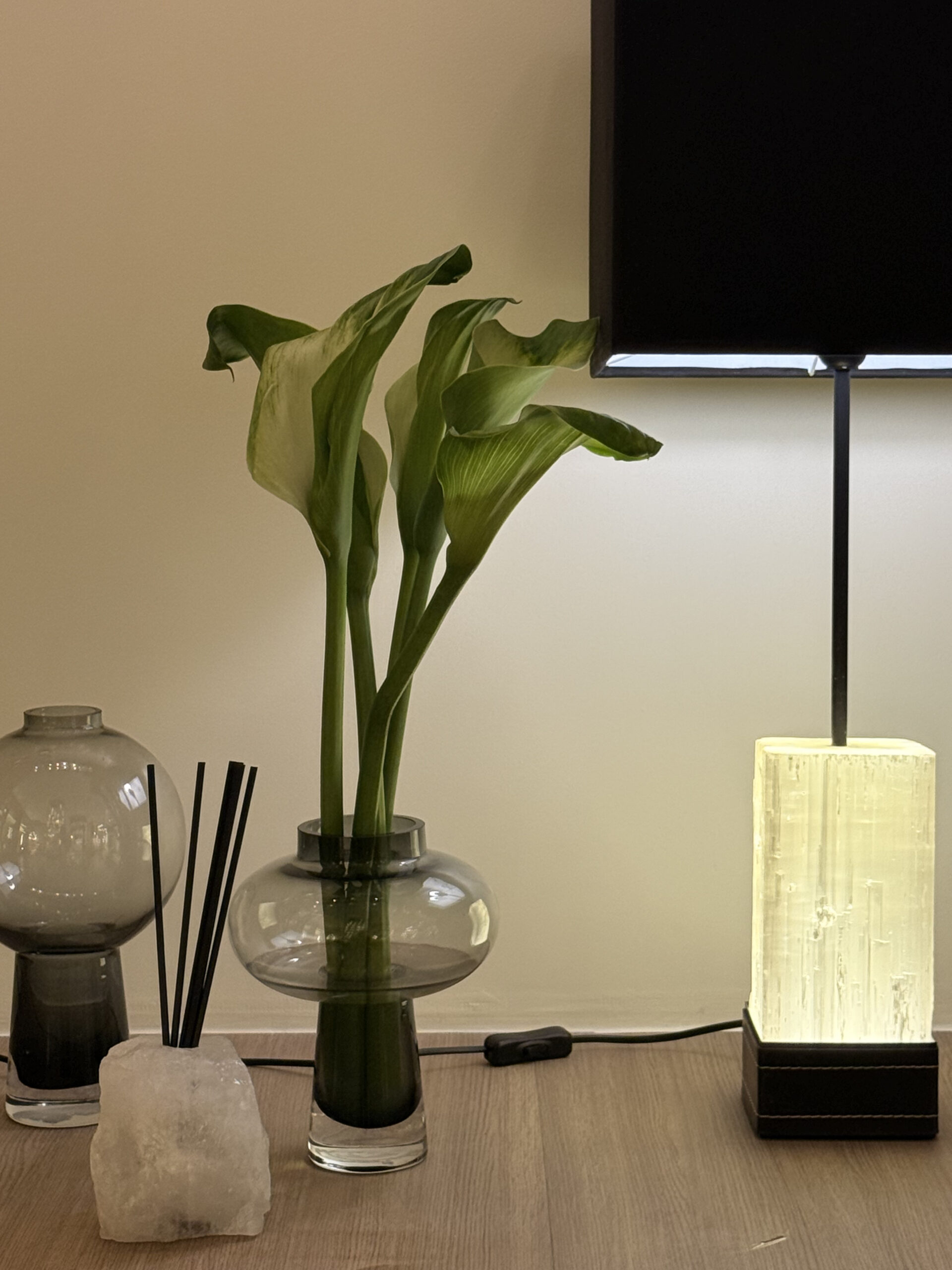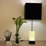 Design: Abajur de piso escultural e de grande presença. Combina a solidez e modernidade da base metálica, a beleza orgânica e iluminada da Selenita e o aconchego clássico da cúpula de tecido. É uma peça que domina visualmente o canto onde é posicionada, funcionando como uma escultura luminosa multifuncional.