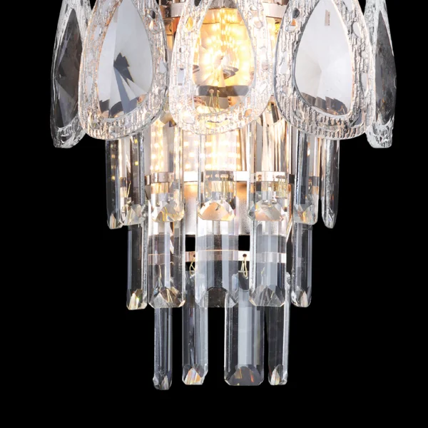 Elementos decorativos ou difusores em cristal transparente (pingentes, facetas ou placas), que captam e refletem a luz, criando efeitos cintilantes e elegantes.