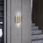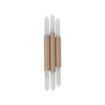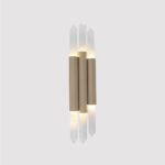Arandela composta por três tubos verticais de quartzo (70cm altura) – uma escultura luminosa de grande impacto. A combinação de múltiplos elementos cria jogo de luz e sombras mais complexo que peças únicas. Uso de lâmpadas MINIGU10 permite fácil substituição e escolha de temperatura de cor.