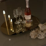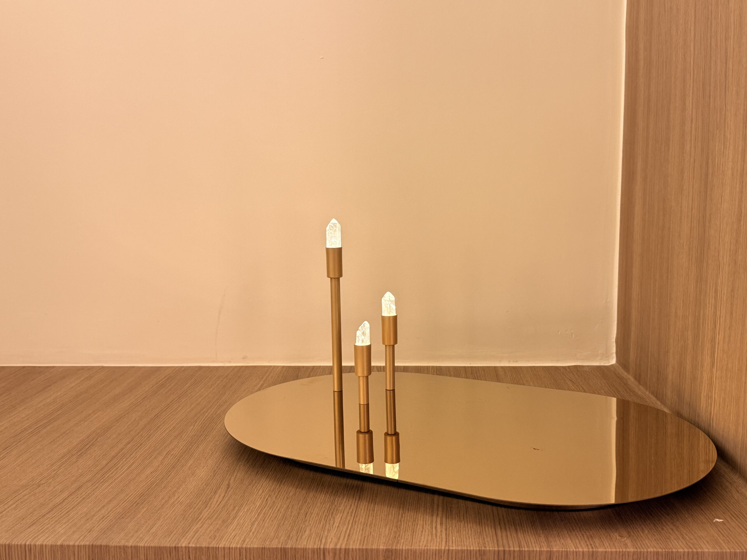 Conceito: Bandeja/centro de mesa com castiçais de quartzo iluminados, sem fios