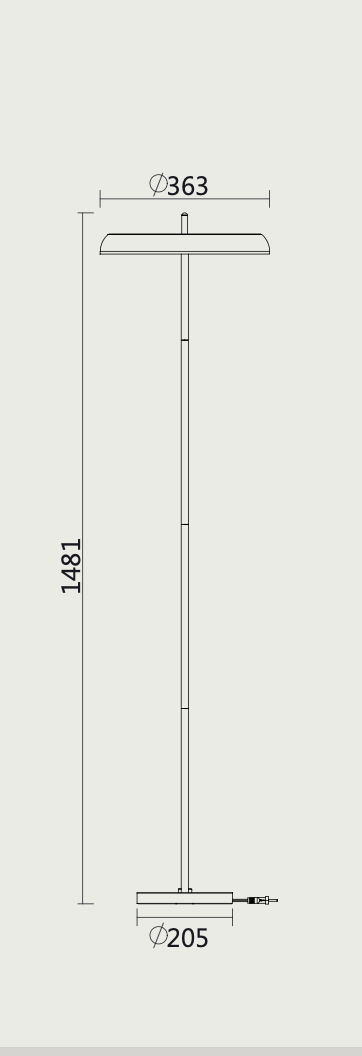 Design: Spot de piso suspenso, com uma silhueta colunar vertical marcante e proporções equilibradas (base larga para estabilidade visual, corpo esbelto). A altura total de quase 1.5m o torna uma peça escultural quando desligado e uma ferramenta de iluminação potente quando ligado. A base larga (prato) garante uma fixação visualmente sólida ao teto.