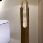 Configuração: Luminária de piso autônoma, com base pesada, haste vertical, braço articulado ou fixo em contrapeso, esfera de Selenita e cúpula superior.