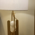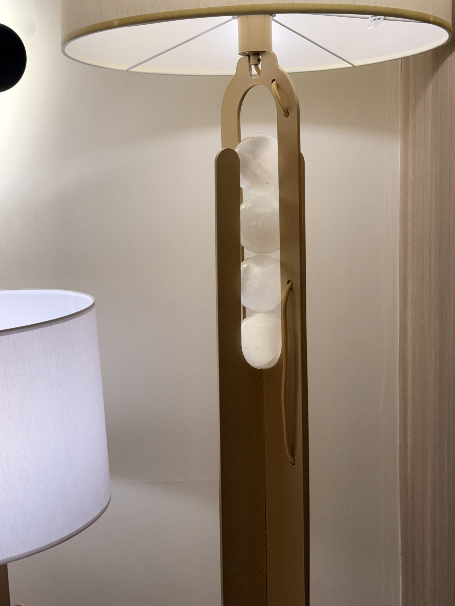 Nota: Versão de piso, de grande porte, da luminária Equilíbrio. Caracteriza-se por uma coluna ou haste vertical da qual parte um braço em contrapeso, sustentando uma esfera de Selenita. A esfera é coroada por uma cúpula difusora, tornando-a uma fonte de luz direcional. Disponível apenas com esfera de Selenita.
