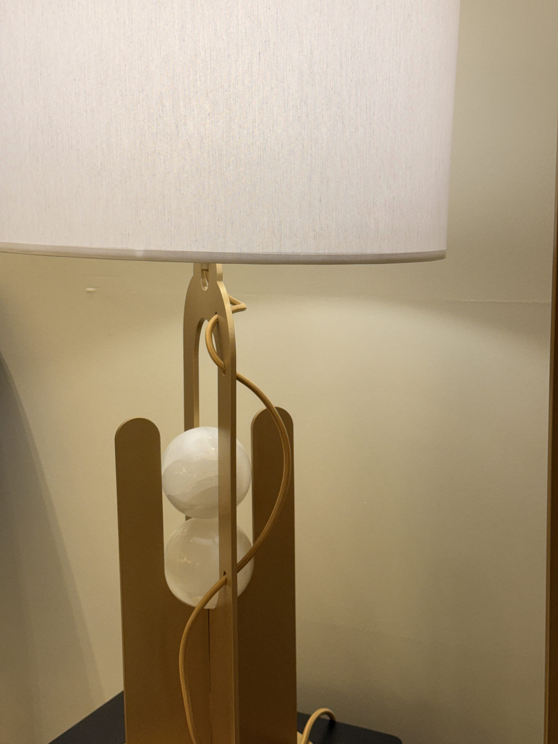 Luminária de piso que é uma escultura cinética estática de grande porte. Diferencia-se por combinar o conceito icônico de equilíbrio com a funcionalidade de uma luminária de piso clássica (cúpula). Oferece dupla funcionalidade luminotécnica (luz direta e ambiente) em um corpo que é uma verdadeira obra de arte tridimensional.