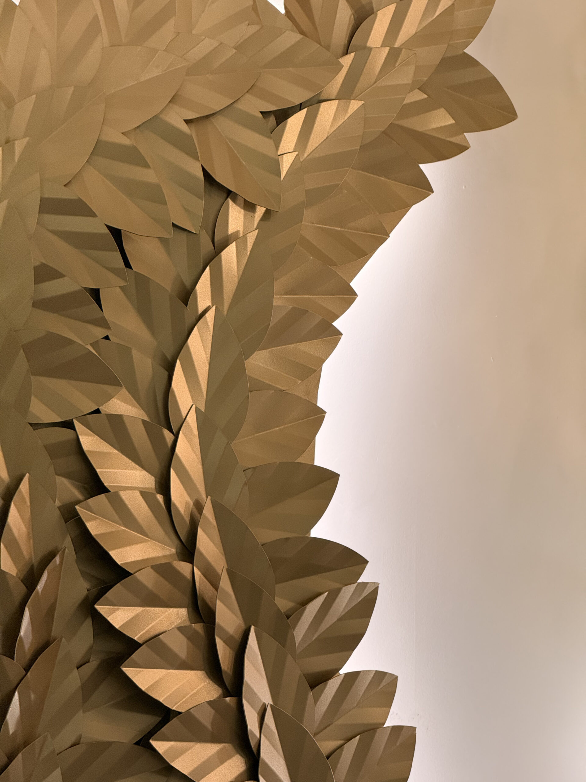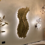 • Efeito: A luz não é o foco principal, mas sim o realce da escultura. Cria um jogo dramático de luz e sombra, destacando a textura e o volume das “folhas” de alumínio. Emite uma luz ambiente indireta e difusa que valoriza a parede e o entorno.