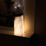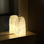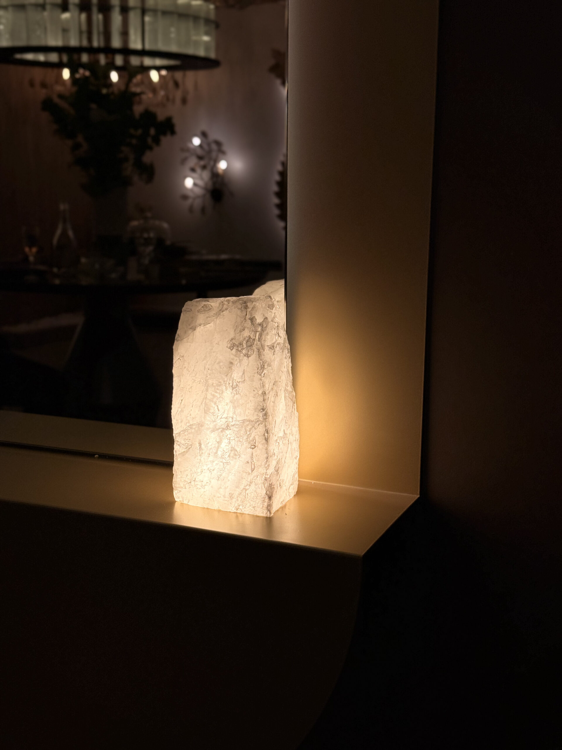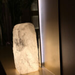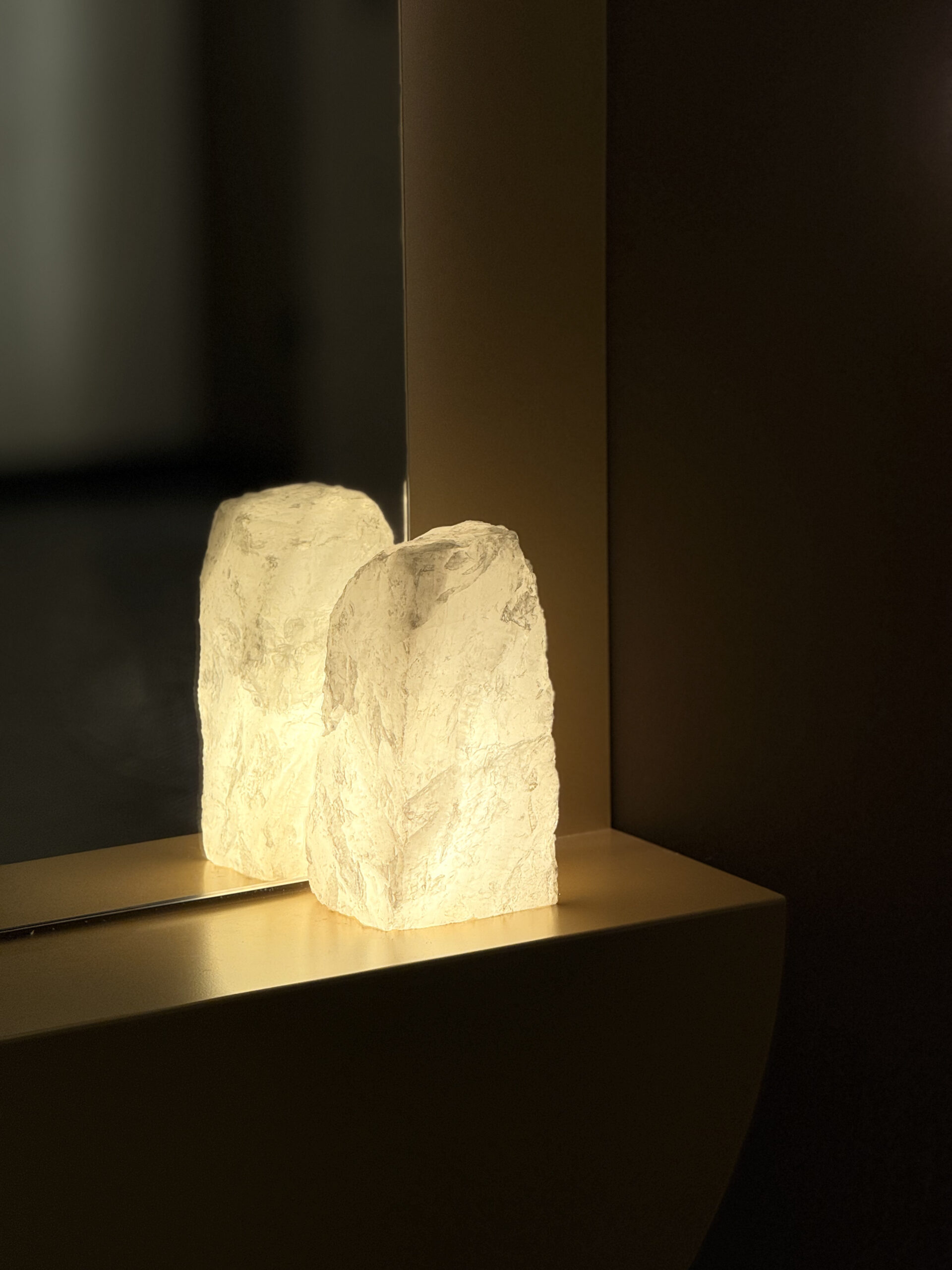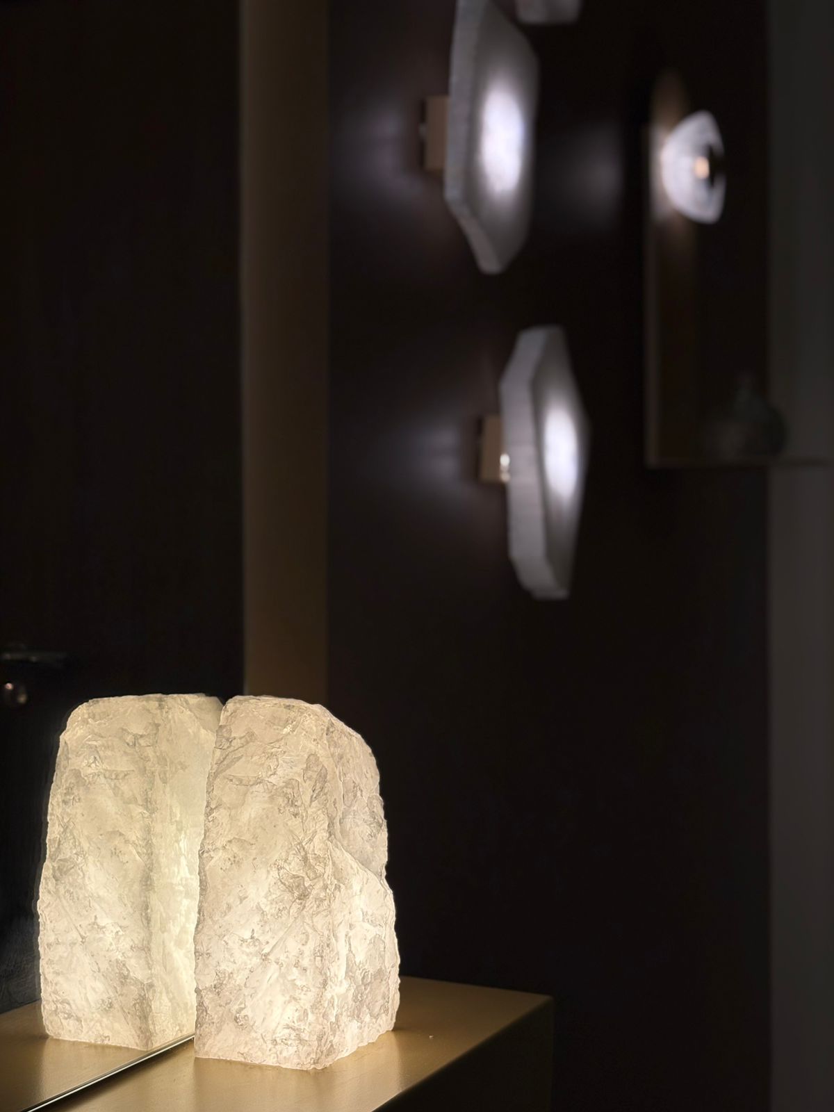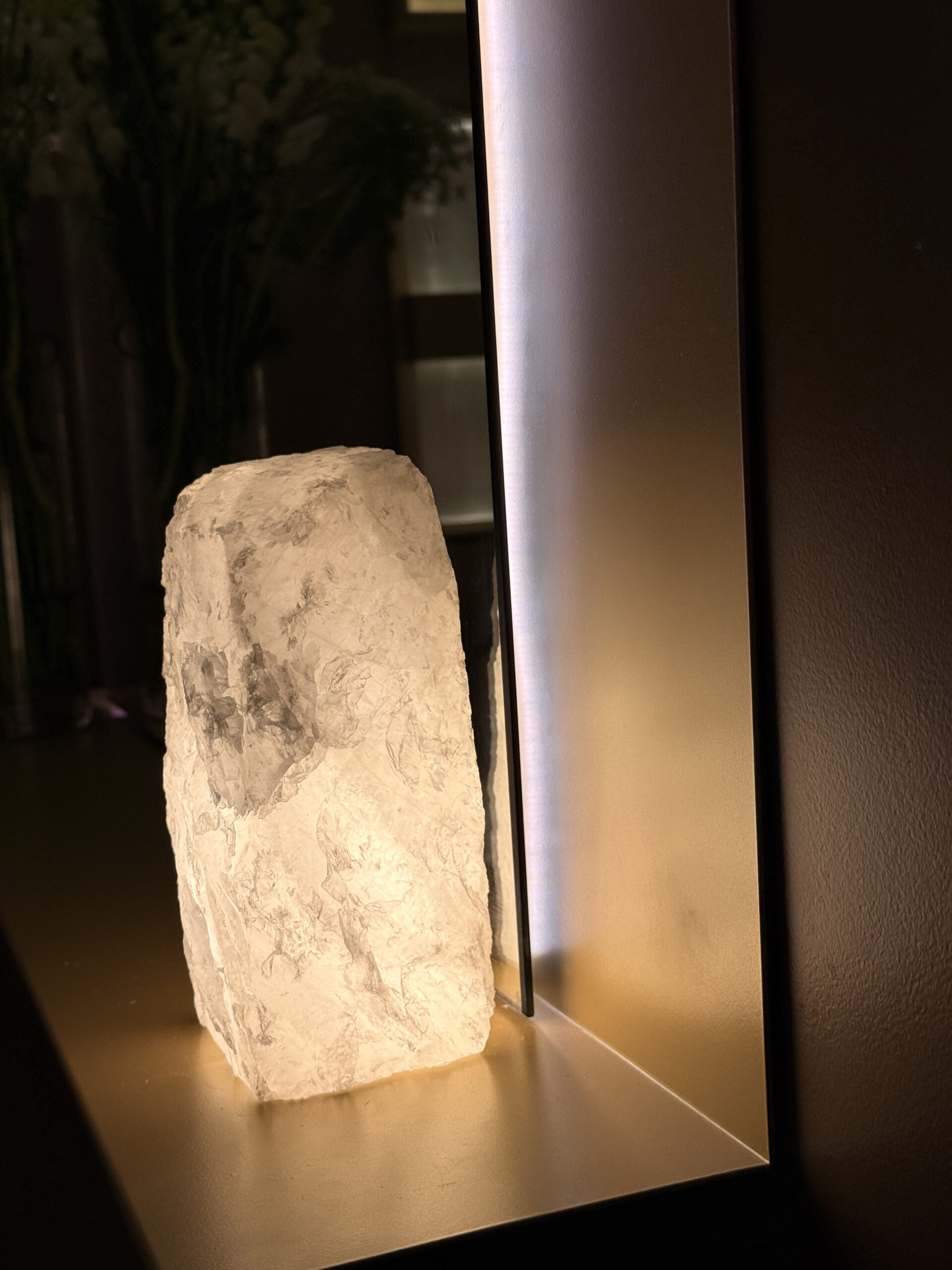 Detalhe especial: Quartzo bruto como elemento decorativo (provavelmente na base ou laterais)