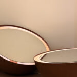 Conceito: Meias esferas espelhadas com iluminação indireta – efeito planetário/astral