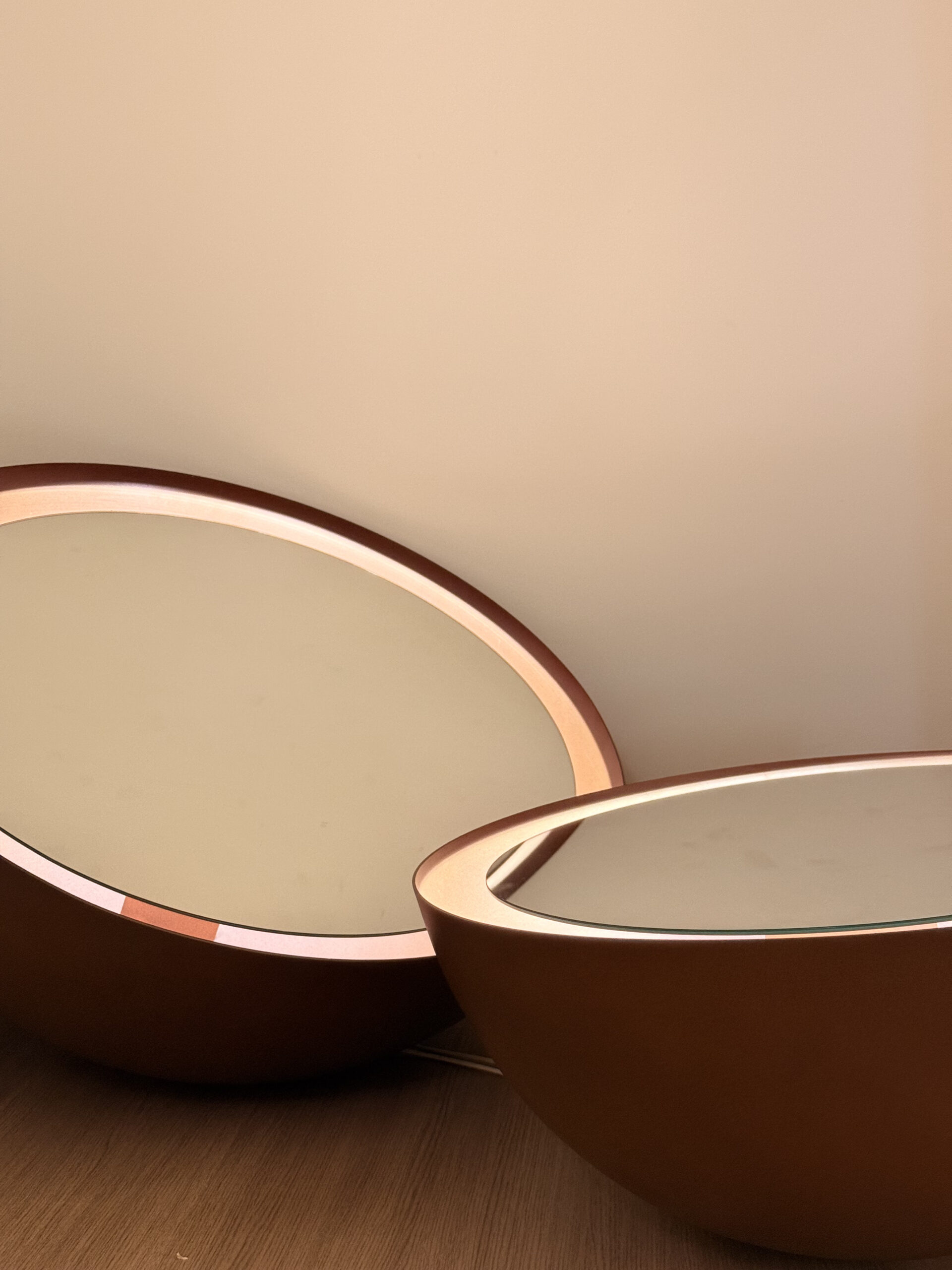 Espelhos em formato de meia esfera (3D) em vez de planos. Cria distorções reflexivas interessantes e efeito planetário/astral. Superfície curva reflete o ambiente de maneira única, criando “olho de peixe” natural. Nome “RE-DOME” sugere redome (redondo + domo) e “re” (reflexão).