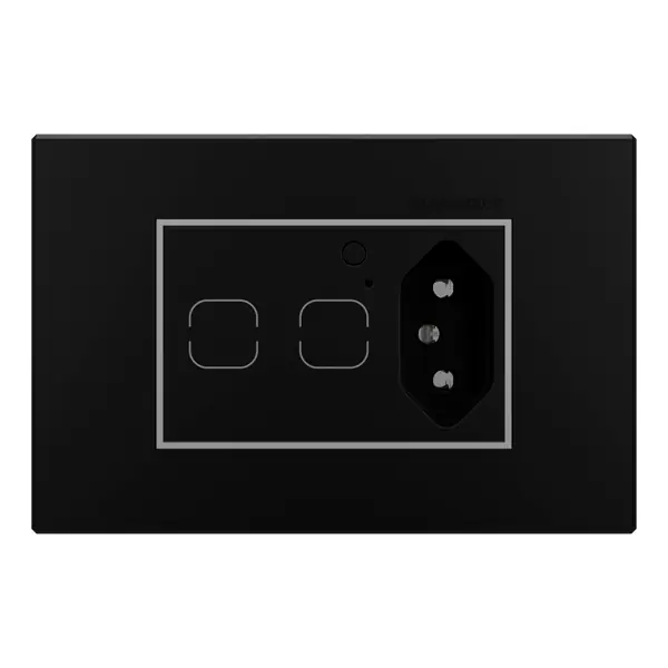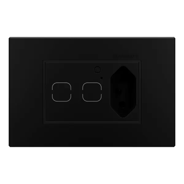 Onde a tecnologia encontra a sofisticação. O Interruptor Duplo + Tomada Inteligente Aura combina em um único produto o controle inteligente de iluminação com a funcionalidade de uma tomada, oferecendo máxima versatilidade para ambientes residenciais e comerciais. Com tecnologia Zigbee 3.0, integra-se perfeitamente a sistemas de automação, permitindo controle remoto via smartphone, programação de cenários, agendamentos e comandos de voz. Disponível em diversas combinações de cores, apresentado aqui na versão Carbon Black com suporte preto.