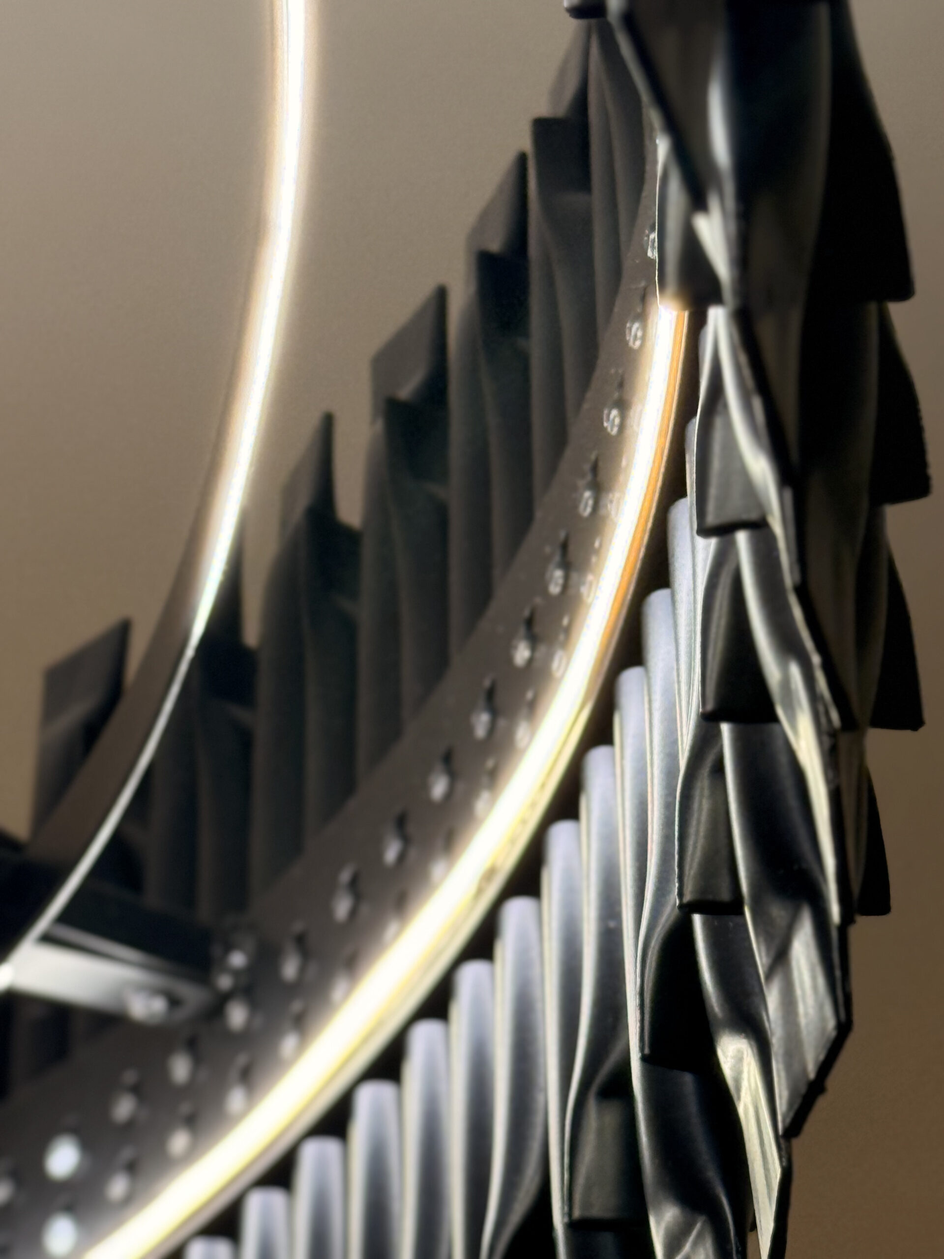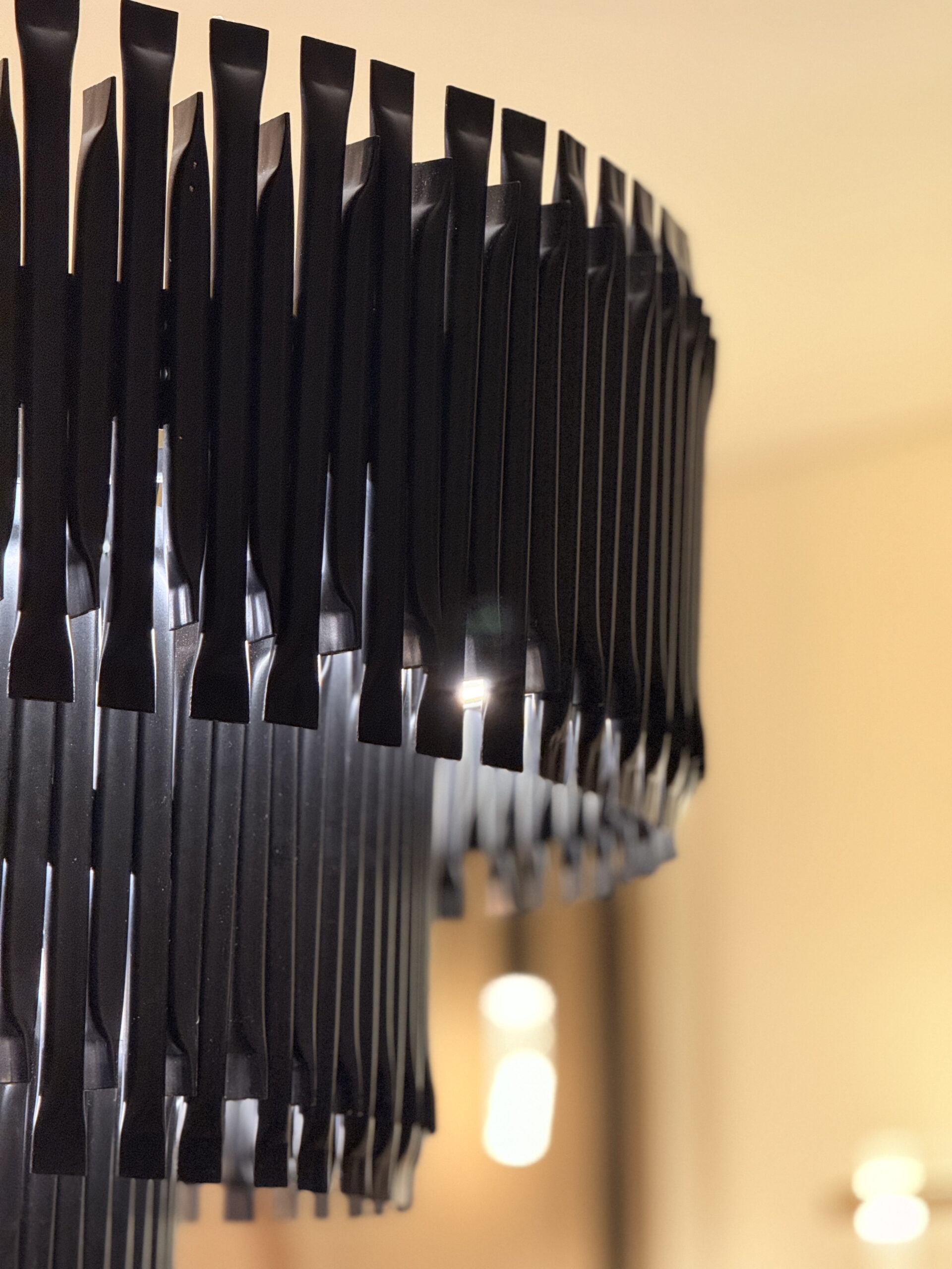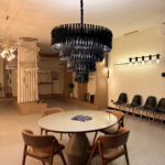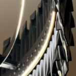 Lustre que reinterpreta estruturas tubulares industriais (como andaimes ou estruturas metálicas) como elemento de design luminoso. Combina estética industrial com acabamentos refinados (dourado, cobre). Crescimento proporcional (mais aros = maior diâmetro = mais altura).
