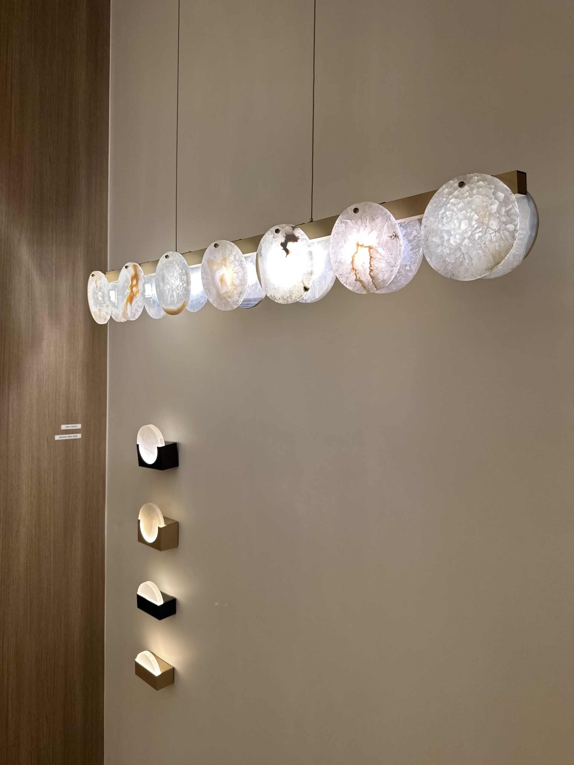 Versão linear da linha Eclipse – discos de pedra natural alinhados em barra reta (não concêntricos). Oferece escolha entre dois materiais naturais (selenita suave vs ágata cristal brilhante) no mesmo formato.