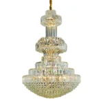 Lustre pendente de design clássico com acabamento dourado e cristais transparentes. Proporciona iluminação ampla, possui tensão bivolt, soquete E14 e capacidade para 44 lâmpadas vela (não inclusas). Ideal para salas, halls e ambientes com pé-direito duplo.