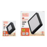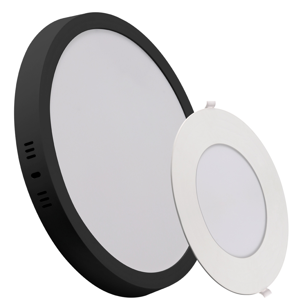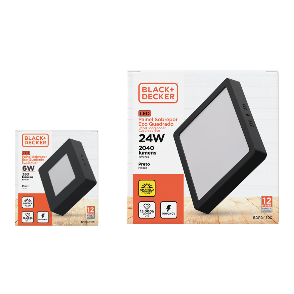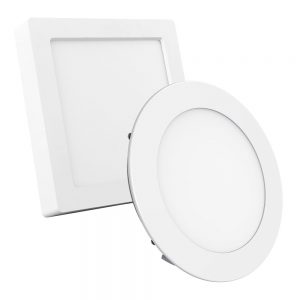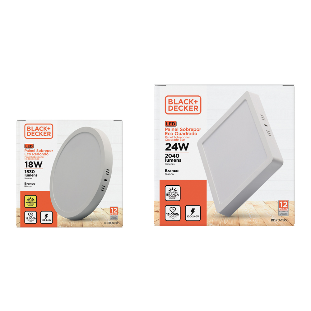 Múltiplas Opções: Disponível em potências de 6W, 12W, 18W e 24W, nos formatos quadrado e redondo, nas cores Branco e Preto, com temperaturas de cor de 3000K (quente), 4000K (neutra) e 6500K (fria).