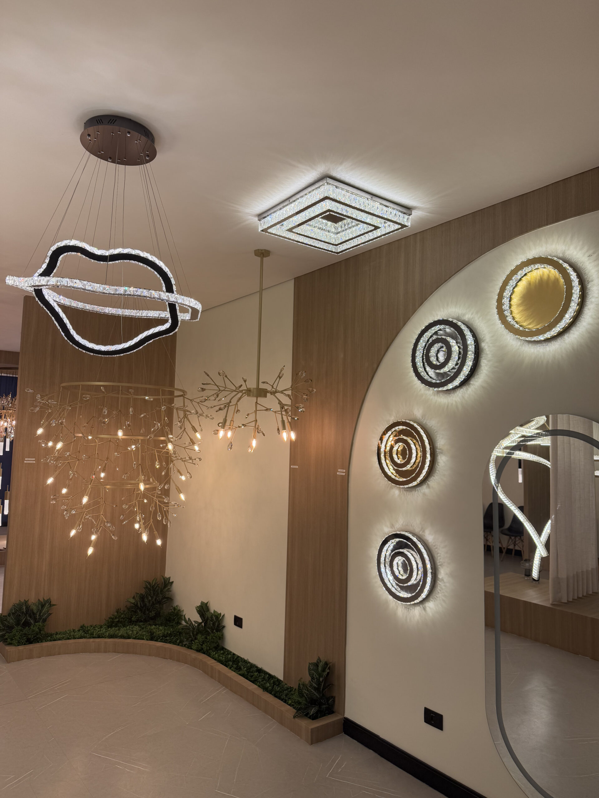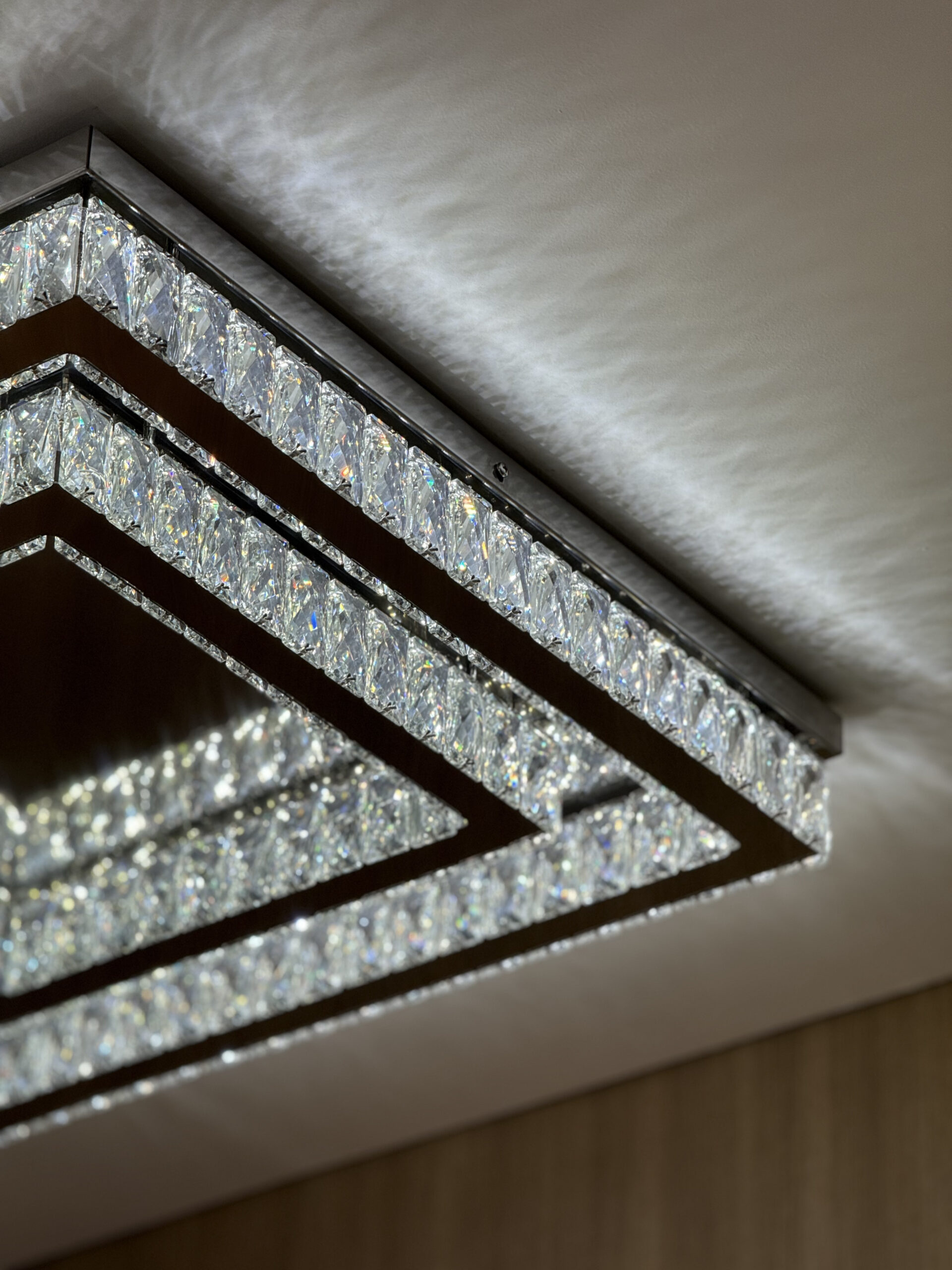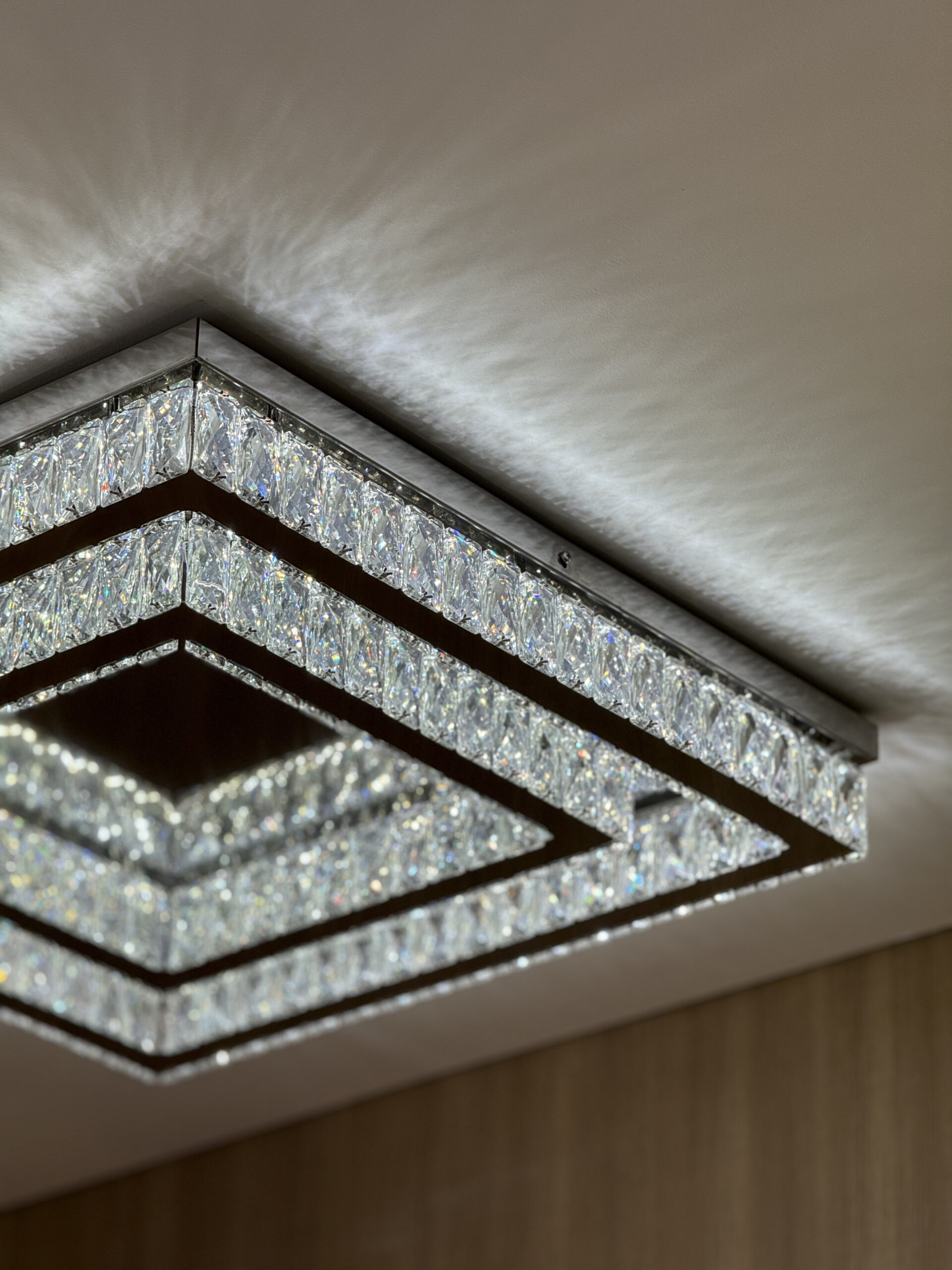 Plafon quadrado combinando luxo (cristais) e tecnologia (LED ajustável). A estrutura em aço inox 304 garante durabilidade premium, e a possibilidade de tamanhos personalizados atende projetos arquitetônicos específicos.