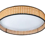 A luz quente (3000K) cria atmosfera aconchegante; o branco e o bambu harmonizam com móveis em madeira e tons neutros.
